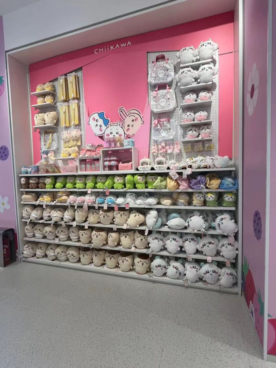 角落还藏着透明小包、发圈这些小物件,连包装都印着圆滚滚的脸。伸手摸一把毛绒公仔,软绵得像揣了团云,连空气里都飘着甜丝丝的可爱气息——这哪里是货架,是把所有软萌都揉进了这一方小天地里。