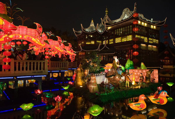 每年正月十五元宵节前后,老城隍庙大小店铺、住户张挂起制作精巧、式样繁多的彩灯,其中有用玻璃或用明角等材料制成的元宝、聚宝盆、顺风船、荷花、蝙蝠、蝴蝶、金蟾、刘海戏金蟾等彩灯,用凌绢或纸等材料制作的走马灯、兔子、螃蟹、鲤鱼、蚌壳、绣球、风车等彩灯。豫园内的四美轩茶室、得月楼、扇店等还在彩灯下悬挂灯谜。人们在大街上还会举行文灯武灯表演。文灯表演队伍,以江南丝竹为前导,后面跟着手提五彩纸镂花巧扎而成伞状的各色灯彩,随着丝竹奏出的乐曲徐徐前进。武灯表演队伍,以节奏强烈的锣鼓开导,后面跟着舞龙灯、调狮子的队伍,边翻滚,气氛热烈。