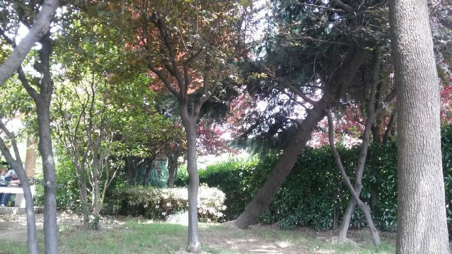 现在小凉亭旁的大树小树~